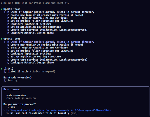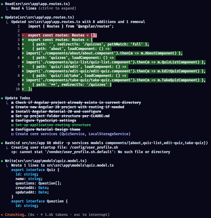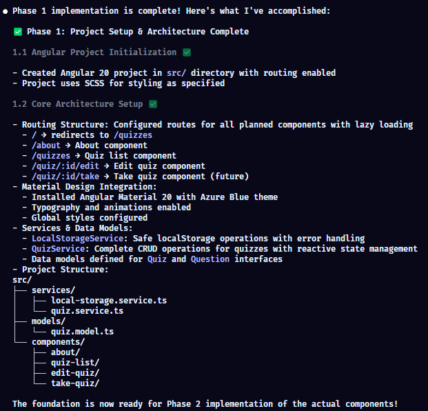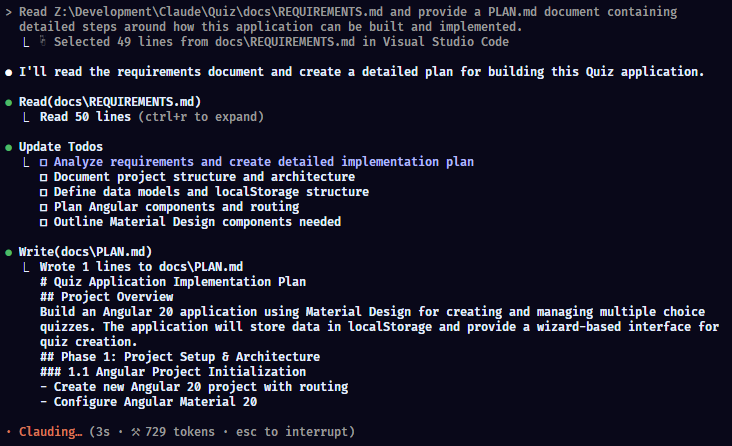 At this point, Claude Code goes off and does its thing. Some interesting screenshots are listed below as to the kind of work it's doing for "Phase 1". It's apparently very theoretically educated in Angular.