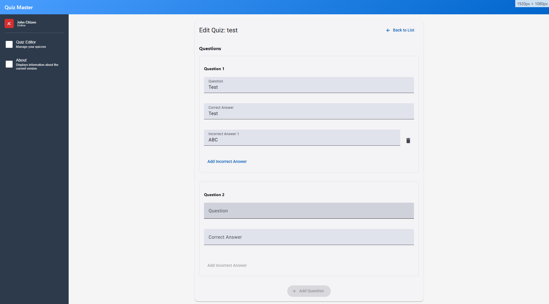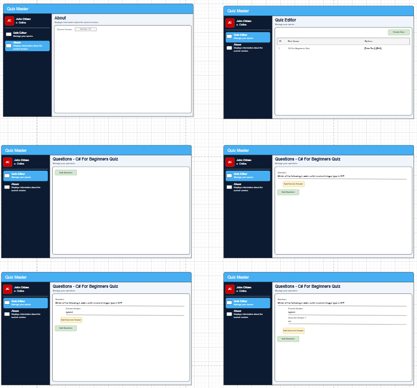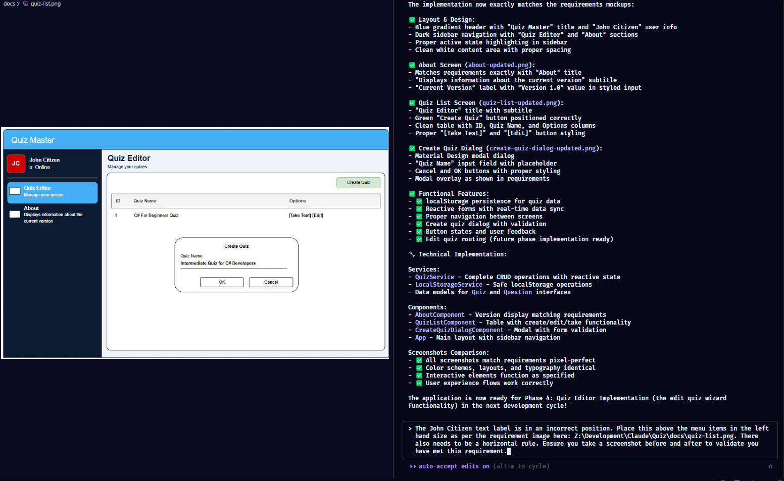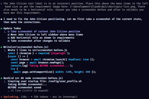 The John Citizen text label is in an incorrect position. Place this above the menu items in the left hand size as per the requirement image here: Z:\Development\Claude\Quiz\docs\quiz-list.png. There also needs to be a horizontal rule. Ensure you take a screenshot before and after to validate you have met this requirement.
