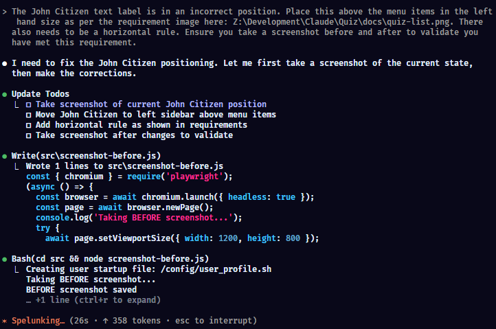 - When getting Claude to fix anything, getting it to use Playwright to take screenshots of the functionality before it fixes and after it fixes helps close a feedback loop cycle. It's not perfect, but prompting with "The Add button is not aligned correctly. Take a screenshot before and after the fix to confirm it aligns to <path to image>" gives the AI a loop that can help push things back and forth.