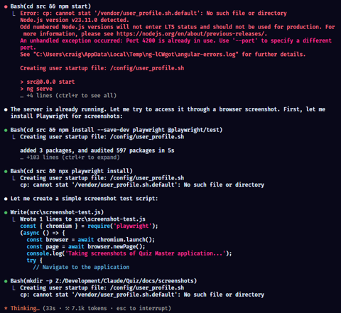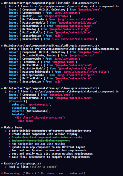During the build, ng serve was reporting several errors. Instead of having to identify each one and fix, the feedback loop provided through the output of the command and screenshot tools helps the AI identify when it has made a mistake and will attempt to rectify it.
