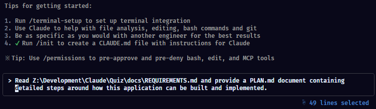 You can get Claude Code to initialise your directory, however if you're using an empty directory - it'll produce a lot of "rubbish" in my opinion. You can instruct Claude Code to update it later anyway, but let's start with some basic instructions for a quiz application in Angular. This file is about providing context to the AI to guide it in how to work and should be maintained throughout.